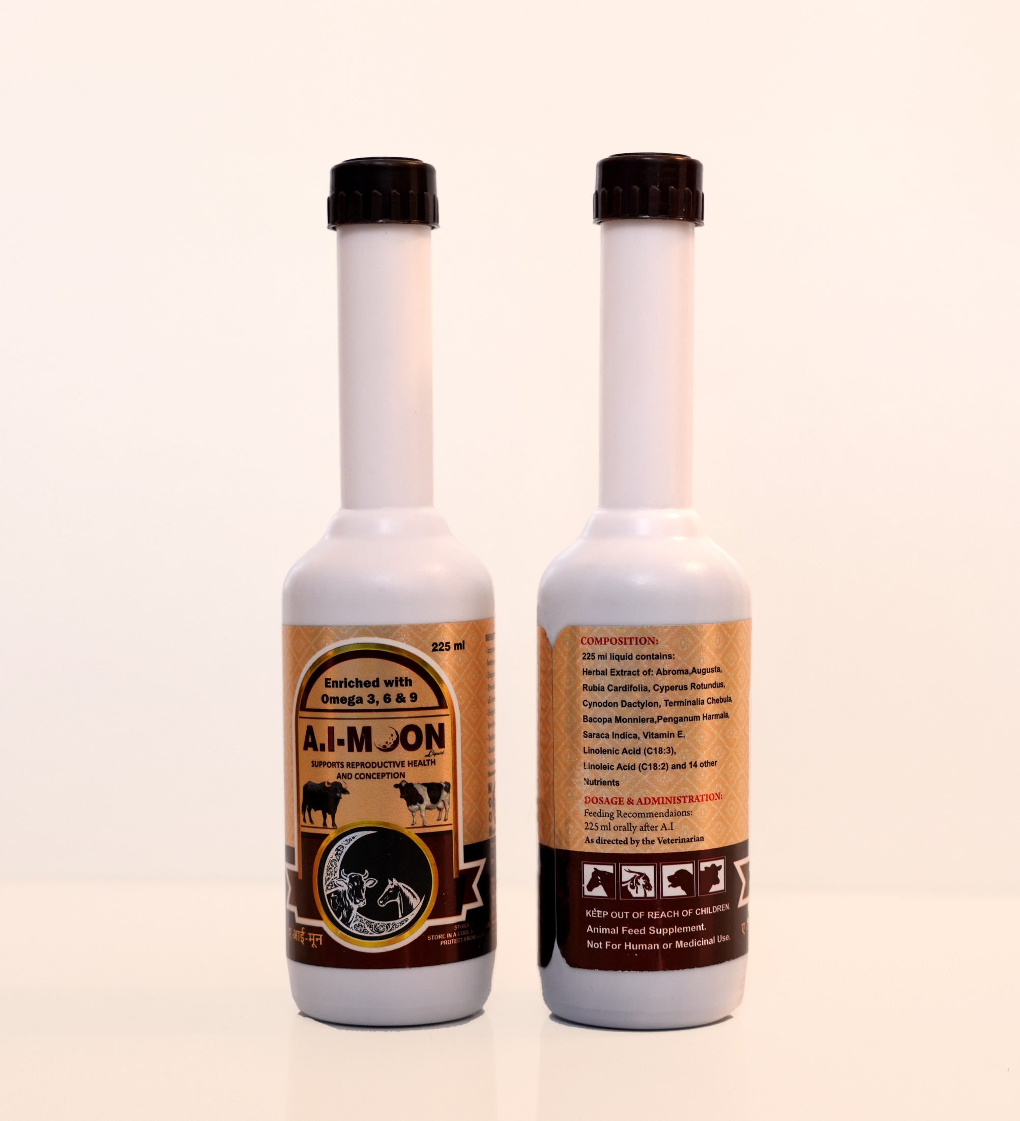 A.I-MOON Liquid is a premium fertility enhancer for dairy animals, enriched with herbal extracts, vitamins, and essential fatty acids. It supports reproductive health, improves conception rates, and enhances overall fertility and vitality in cattle and buffaloes.