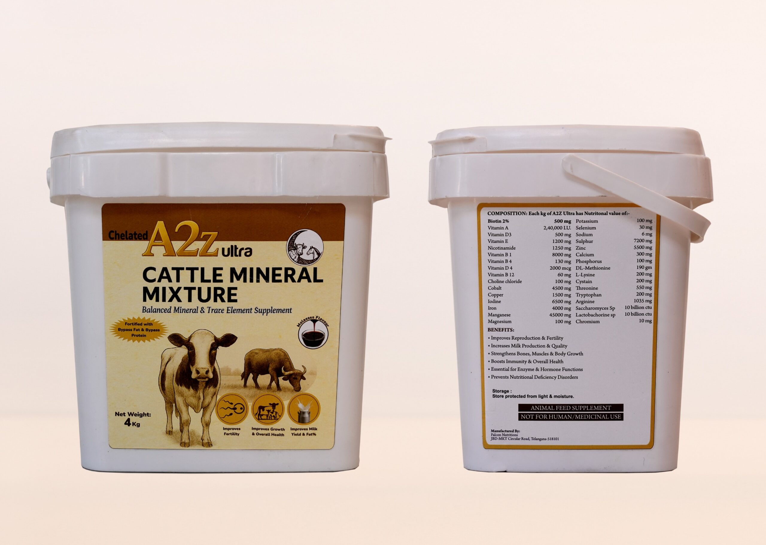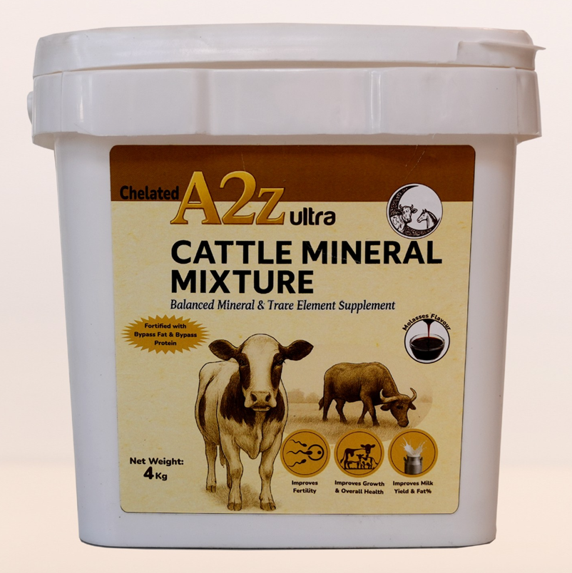 A2Z Ultra Cattle Mineral Mixture is a balanced blend of chelated minerals, trace elements, and vitamins formulated to enhance milk yield, fertility, and overall health of dairy animals. Fortified with bypass fat and bypass protein, it supports growth, immunity, and productivity in cows and buffaloes.