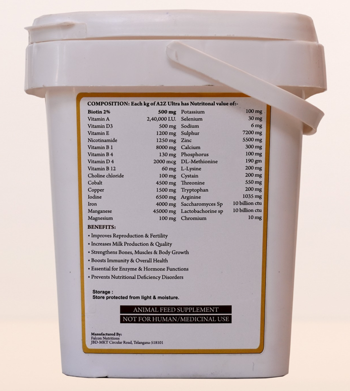 A2Z Ultra Cattle Mineral Mixture is a scientifically formulated chelated mineral and trace element supplement designed to improve the health, fertility, and productivity of dairy cattle. Enriched with essential vitamins, amino acids, and probiotics, it ensures balanced nutrition and boosts overall performance. The product is also fortified with bypass fat and bypass protein for enhanced milk yield and body growth.